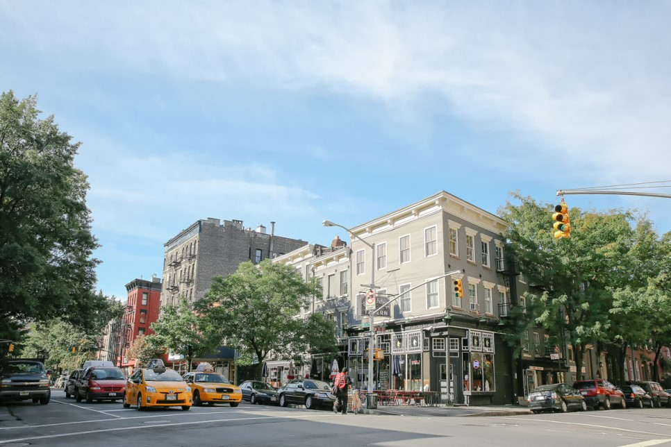 높은 빌딩이 없는 아늑한 그리니치 빌리지의 쇼핑가, 블리커 스트리트.