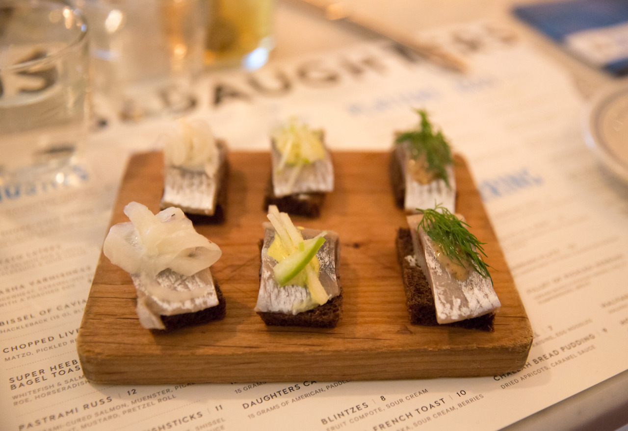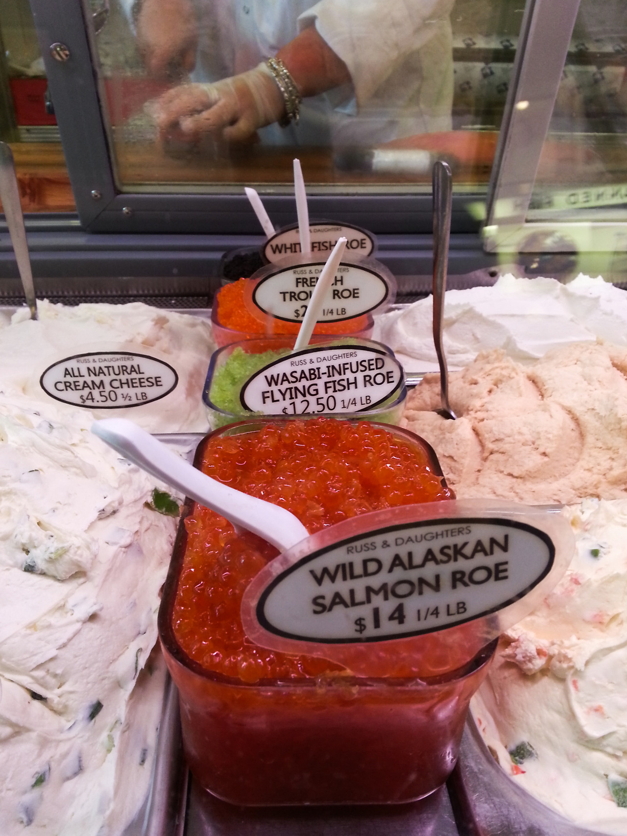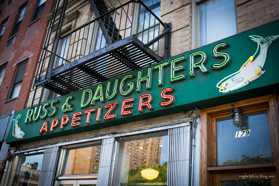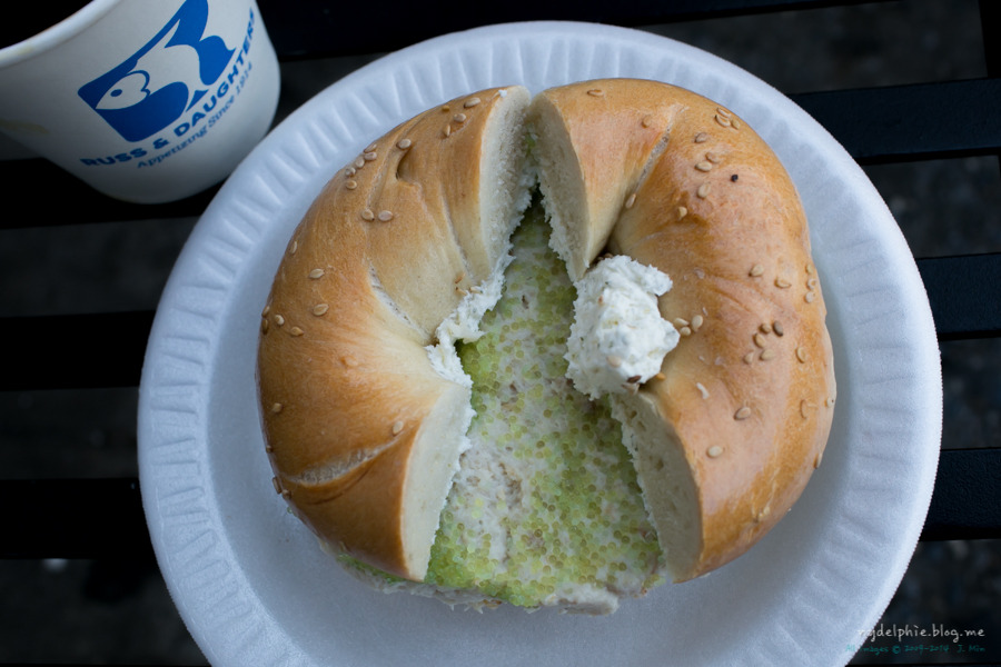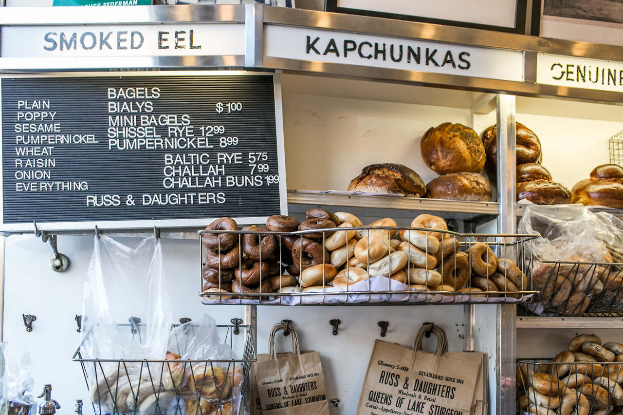 다소 작고, 딱딱하고, 쫄깃한 베이글을 반으로 잘라 크림치즈, 연어, 양파 등 다양한 속재료를 넣어 먹는데 그런 속재료를 전문적으로 파는 유대인 식료품점을 애피타이징 스토어라 한다.속재료를 돋보이게 하는 역할에 가장 충실한 것이 베이글의 정석이며 이를 밧볼 수 있는 가게가 러스앤도터스인 것이다.