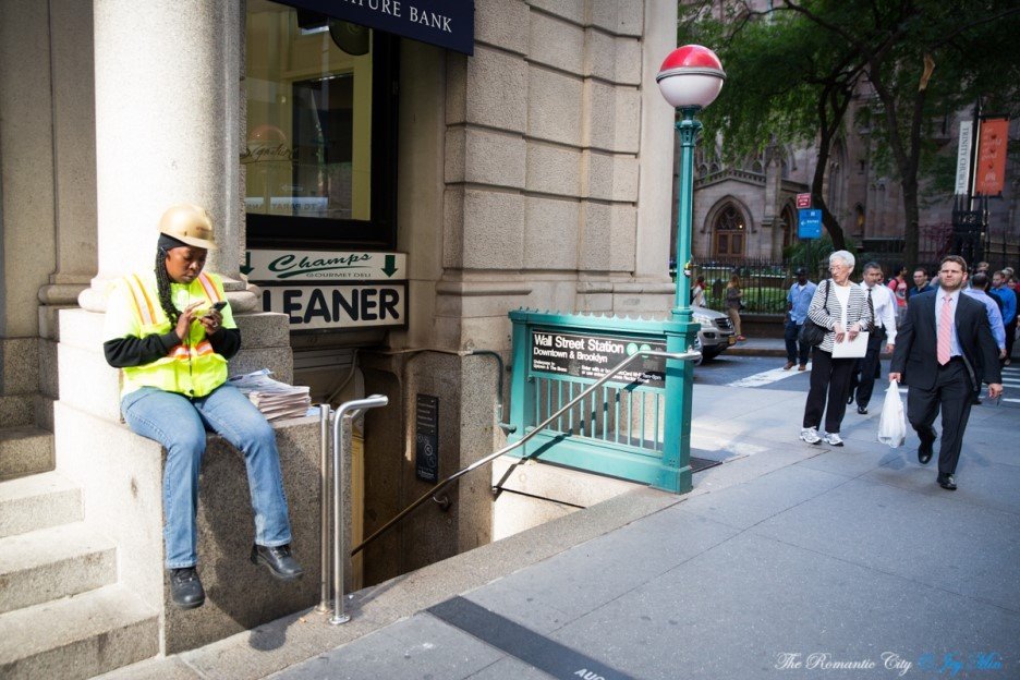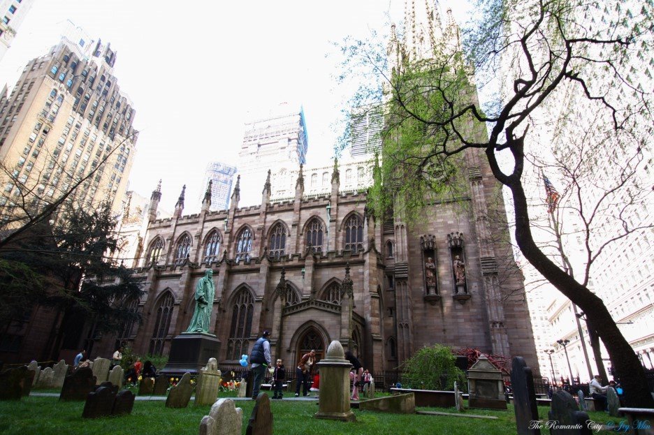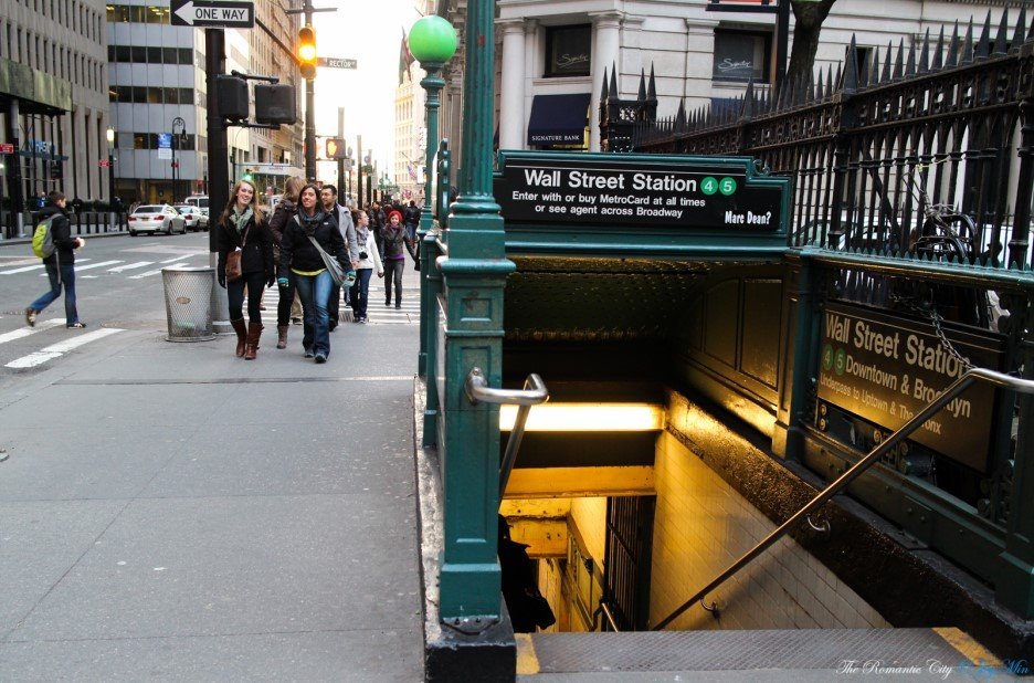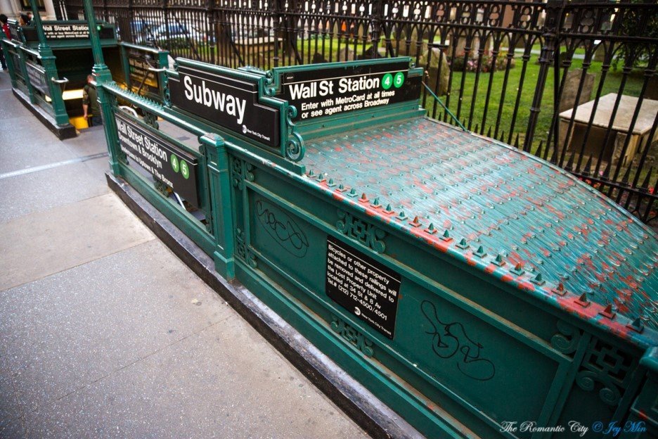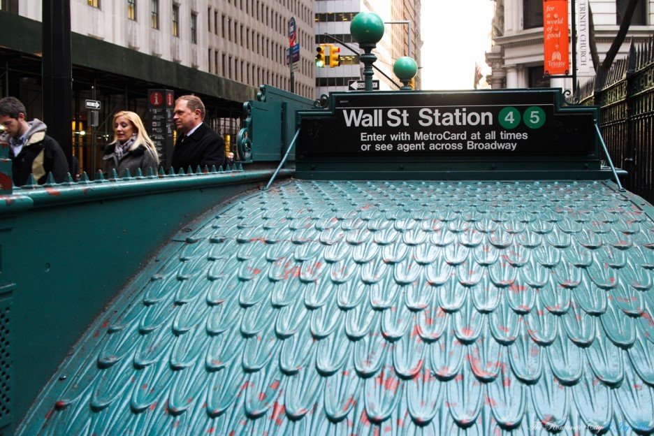 독특한 문양의 철판 지붕이 원형 그대로 보존된 월스트리트 역(4,5호선)입니다. 나뭇잎을 상징하는 패턴이라고 하는데, 실제로 보면 용의 단단한 비늘을 연상시킵니다. 밖으로 나서면 트리니티 교회가 한눈에 들어옵니다. 교회 바로 맞은편이 월스트리트의 입구.