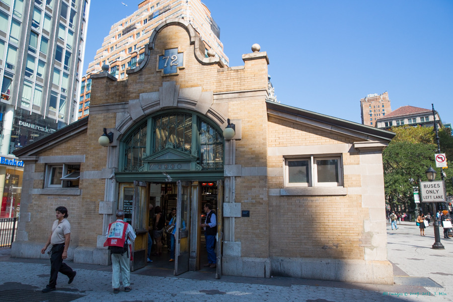 1904년에 세워진 어퍼 웨스트의 72St 역사는 매우 독특합니다. 지난 포스팅에서 보여드린 로어 맨해튼의 볼링그린역과 비슷한 형태를 갖고 있는데, 이런 형태의 지하철 역사를 컨트롤하우스(Control House)라고 부릅니다. Astor Place처럼 간단한 형태의 키오스크로 충분치 않은, 유동인구가 많은 지역에 이러한 컨트롤하우스 역사를 세웠습니다. 백 년 전 지어진 지하철 플랫폼인지라 지상까지 오르는 계단의 폭이 비정상적으로 좁아서 지나다닐 때 주의해야 합니다.