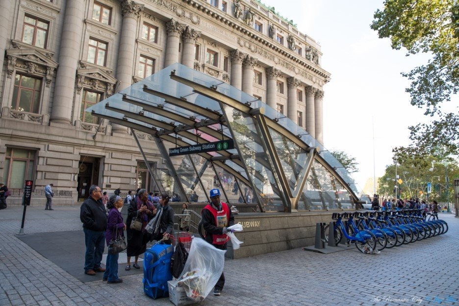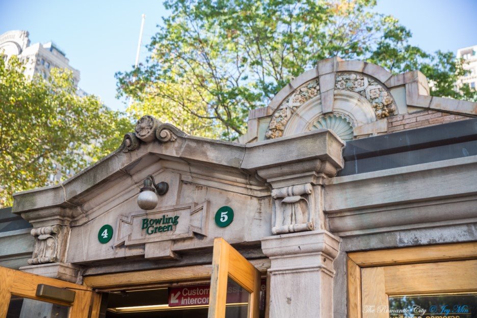 볼링그린은 배터리파크 북쪽의 작은 공원의 이름입니다. 1733년에 만들어진 이 공원은 뉴욕에서 가장 오래된 공립공원이자, 뉴욕이 '뉴암스테르담'이라 불리던 초창기에는 야외 볼링장으로 사용되기도 했습니다. 배터리파크와 연결된 볼링그린역의 남쪽 출입구는 20세기 초 지하철역의 원형을 그대로 보존하고 있습니다. 배터리파크와 자유의여신상 표지판을 따라가면 고풍스러운 역 밖으로 나올 수 있습니다.