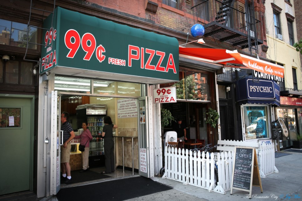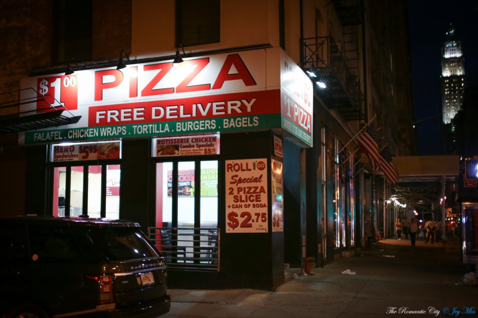 피자 한 판을 혼자 다 먹기에는 부담스러운 크기다 보니 한 조각씩을 잘라 파는 피자가게들이 생겨났다. 피자 한 조각의 가격이 지하철 편도요금의 가격과 연동된다는, 이른바 Pizza Principle (Pizza connection)이라는 피자의 법칙까지 있을 정도. 문제는 지하철 요금이 피자 한 조각보다 훨씬 비싸졌다는 것인데, 현재 지하철 편도 요금은 $2.75로 올랐지만 여전히 한 조각에 1달러짜리 피자도 있고, 음료수를 포함한 $2.75짜리 메뉴를 만드는 등 피자 커넥션을 노린 마케팅은 계속되고 있다.