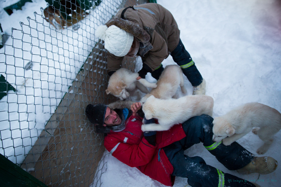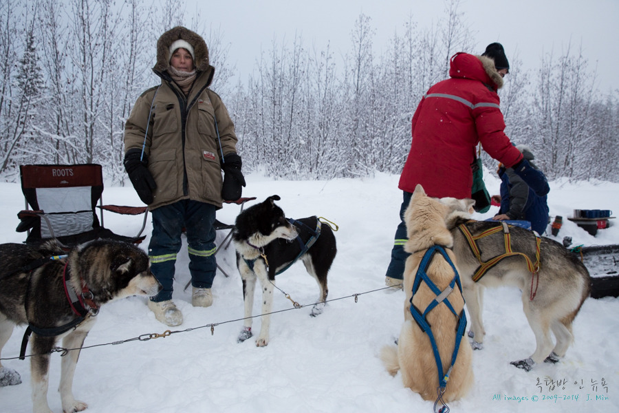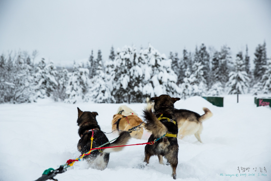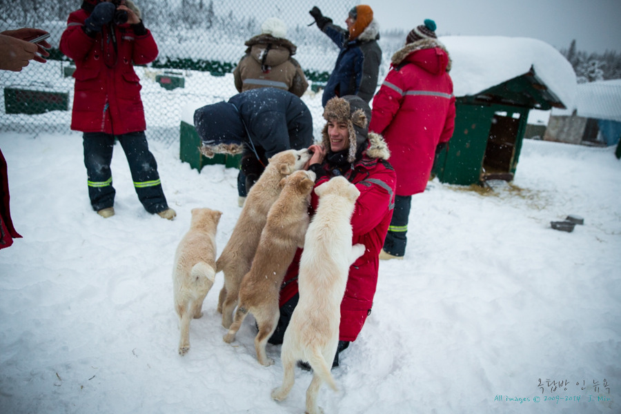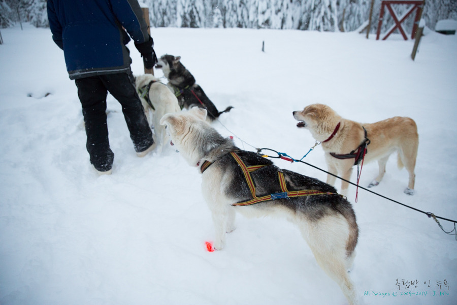 산책을 나가기 직전의 흥분을 이기지 못하고 썰매에 묶인 개들이 요동 칠 때마다 썰매가 들썩거렸다. 시베리안 허스키로만 무리를 이루면 일반인은 도저히 그 힘을 감당할 수 없어 대열에 서너 마리의 다른 견종을 섞어놓았음에도 통제가 어렵다.