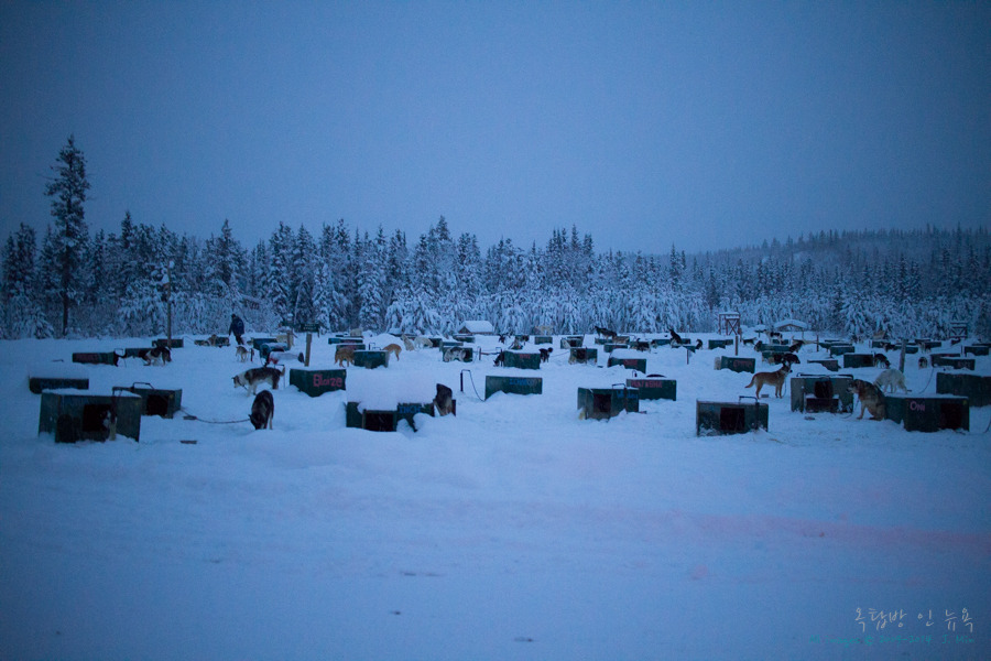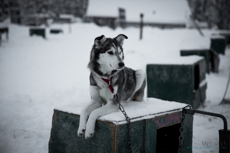 개썰매 체험을 위해 아침 일찍 길을 떠났다. 시퍼런 밤의 기운이 가시지 않은 시각, 썰매견들의 거처에 도착했다. 알래스카에서 유콘까지, 장장 1,600km를 개썰매로 달리는 유콘 퀘스트(Yukon Quest) 대회에 무려 24회나 참가하고 우승 경력까지 보유한 전문가 프랭크 터너가 운영하는 Muktuk Adventures에는 백여 마리의 썰매견이 산다. 작은 집 하나에 개 한 마리씩. 눈구덩이를 파고 들어간 녀석도, 낯선 인기척에 호기심이 동해 지붕 위에 올라앉은 녀석도 있다. 밖에서 자는 아이들은 건강한 현역들이고, 은퇴한 노견들은 집 이곳저곳을 어슬렁대며 여생을 보낸다.