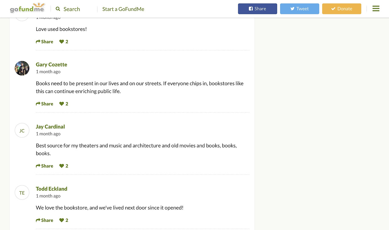 이 곳을 이렇게 보낼 수 없다는 주민들이 뜻을 모아 미국의 대표적인 클라우드 펀딩 사이트인 고 펀드 미(GoFundMe)에 이 소식을 알린 후 후원금 모집을 시작하였고 여러 동네 커뮤니티 게시판에서도 서점과 펀딩 소식을 알리며 서로 독려하기 시작하였다.