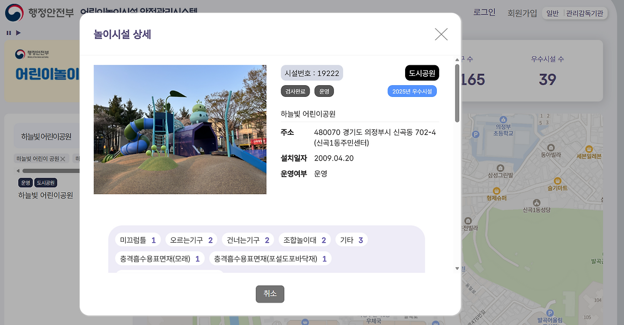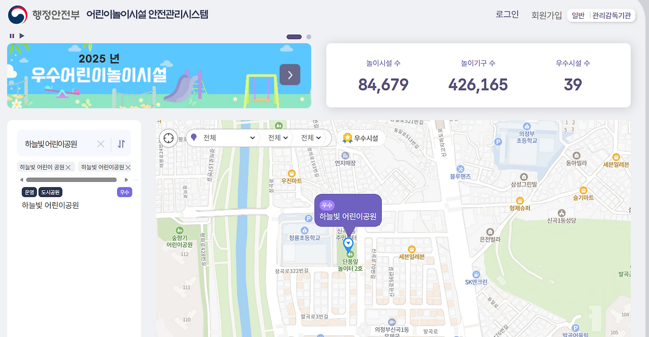이러한 우리의 진심이 통한 걸까? 올해 4월 의정부시에 조성한 단풍잎 놀이터 2호(하늘빛 어린이공원)가 행정안전부에서 주관하는 2025년 우수 어린이 놀이시설로 선정되었다. 관계자에 따르면 '우수 어린이 놀이 시설'은 놀이 시설이 정부로부터 받을 수 있는 유일한 상으로, 올해는 전국 8만 4천여 개의 놀이시설 중 8곳이 선정되었으며, 8곳 중 실외에 위치한 공공 놀이터는 단풍잎 놀이터 2호 포함 단 2곳뿐이다. 선정된 놀이터는 향후 3년간 '행안부 어린이 놀이 시설 안전 관리 시스템'에 우수 시설로 등록되며, 앞으로 놀이터 조성의 모범 사례로 활용된다.