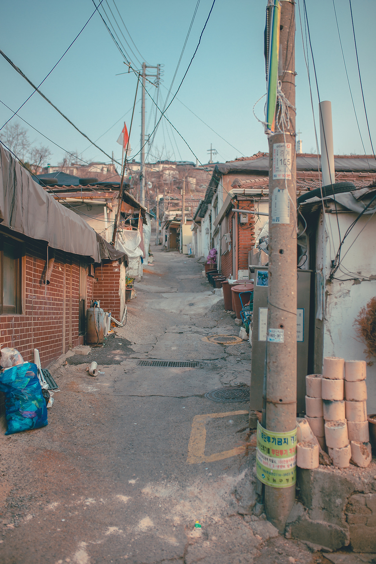 마을 초입에 있는 집들은 온기는 느껴지지 않았지만 사람이 살고 있는 듯한 모습이었다. 그러나 허리를 숙이지 않으면 오르기 힘들 정도로 경사진 언덕 양옆으로는 사람의 흔적이라는 좀처럼 찾아볼 수 없었다. 속살이 들어 날 정도로 녹이 슨 대문과 재색을 잃어버린 담벼락, 흔적만 남겨져 있는 집 터에 잔뜩 쌓인 쓰레기 더미들. 한눈에 봐도 여긴 사람이 사는 곳, 아니 사람이 살 수 있는 곳 같지 않았다.