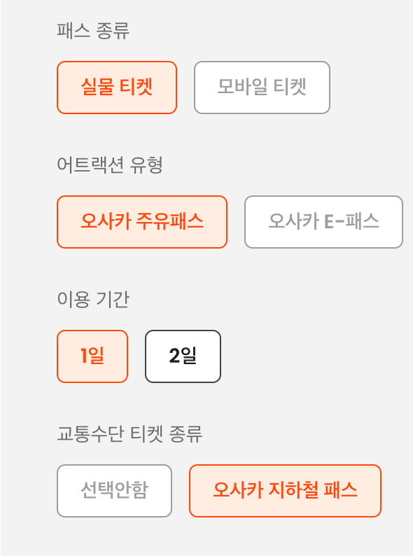 1일권을 선택할 경우 실물티켓 - 오사카 주유패스 - 1일 - 오사카 지하철 패스 순으로 선택해야 합니다. 조금 복잡하게 해두었습니다. 모바일 티켓의 경우는 오사카 e패스이며 주유패스에서 교통패스 기능이 빠진 패스 입니다. 모바일이라 변할 것 같지만 직접 이용해보니 캡쳐된 QR코드 이미지를 보여줘야 하고 오사카성 입장도 불가능해 매력적이진 않습니다.
