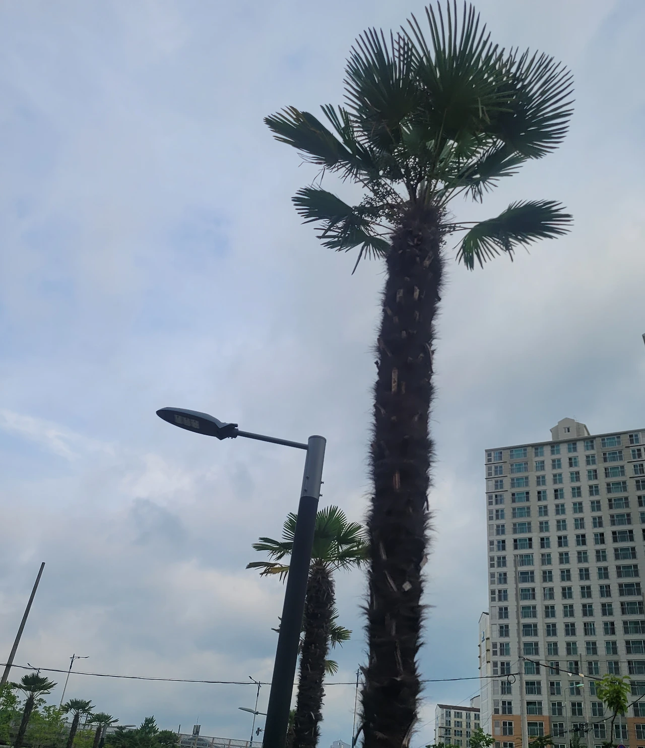 그런데 오늘 아침 공원길을 걷다가 문득 고개를 살짝 들어보니(사실 저는 땅을 보며 걷습니다) 눈앞에 야자수가 있는 게 아닙니까? 엥? 여태까지 왜 야자수가 있는 걸 몰랐지? 땅만 보며 걸었으니 몰랐겠죠.