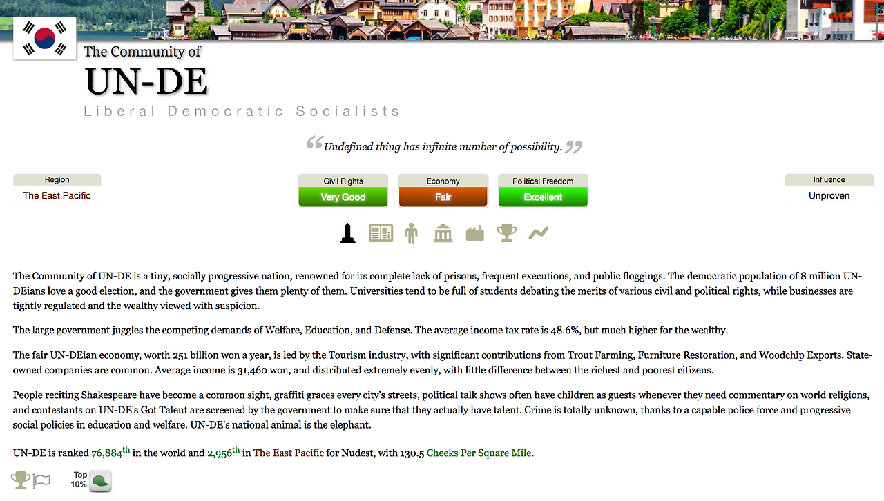 쉽게 답이 떠오르지 않는 것은 당연하다. 'NationStates'라는 게임 속에만 존재하는 가상 국가 '언디'의 이야기니까. 요즘 뭐 재밌는 것 없나. 어느 날 소파에 누워 빈둥거리고 있는데 친구가 문자를 보내왔다. 이거 하는데 네 생각 많이 나더라. 너 완전 좋아할 것 같아. 그 얘기에 컴퓨터를 켜고 곧장 시작했다. 아니나 다를까. 내 취향 저격의 게임이었다. 애초에 게임을 좋아하고, 무엇이든 생각할 수 있도록 질문을 던져주는 게임이라면 더더욱 환영이다.