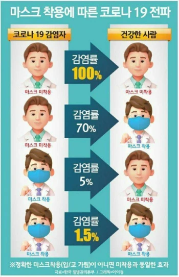 실제 질병관리본부가 발표한 자료에 따르면 코로나 감염률은 모두 마스크를 착용하고 있을 시 1.5%밖에 되지 않는 놀라운 결과가 있었습니다. 이와 반대로 마스크 미착용 시 100% 확률로 감염이 된다고 알려졌죠. 또한 감염자가 마스크를 제대로 착용하고 있다면, 타인이 마스크를 착용하지 않았어도 5%의 낮은 감염률을 보였습니다.