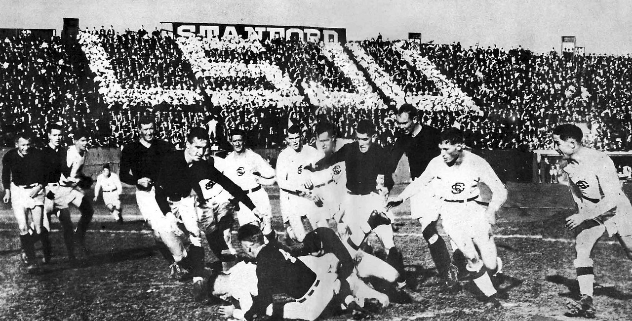 1892년 3월 19일, 스탠퍼드와 UC 버클리는 샌프란시스코 헤이트 스트리트 구장에서 캘리포니아 최초의 대학 간 풋볼 경기를 치렀다. 스탠퍼드 팀의 매니저는 훗날 미국 대통령이 되는 허버트 후버였다. 1만5천 석 규모의 구장에는 약 2만 명이 몰려들었다. 그런데 정작 경기 공이 없었다. 기마 전령이 시내로 보내져 공을 가져왔고, 경기는 한 시간 늦게 시작됐다. 이날 경기 수입은 3만 달러에 달했고, 양쪽은 그 돈을 다음 시즌 팀 운영 자금으로 돌렸다.