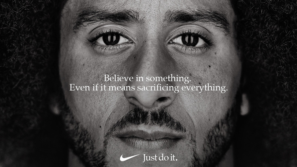 나이키의 화법(마케팅)은 여전하다. 2018년 JUST DO IT 30주년 기념 광고에는 미식축구 선수 콜린 캐퍼닉이 등장한다. 나이키가 그를 선택한 이유는 간단하다. 콜린 캐퍼닉은 경찰의 흑인 과잉진압과 같은 인종차별 문제로 얼룩진 미국에 의도적 무례함을 표하기 위해, 경기마다 울려 퍼지는 미국 국가에 충성하는 대신 무릎을 꿇었다. 일부 층에게 분노를 샀고, 트럼프는 특히 진노했다. (개새끼들이라며 욕설난무) 그러나 미국의 젊은 층은 열광했다. 시대가 원하는 것은 억압이나 군림이 아닌, 평등과 자유였으니까.