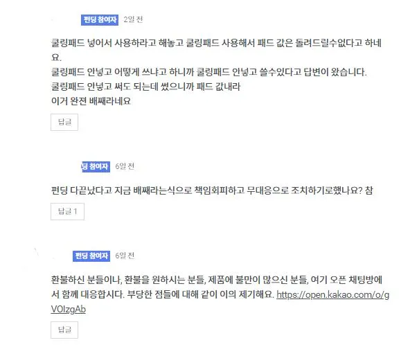 메시지를 통해서만 응대를 하겠다고 판매자(메이커)가 공지를 올렸으나, 만족스러운 대응이 되지 않아 구매자(서포터)들이 자발적으로 오픈 채팅까지 만들고 나섰다.