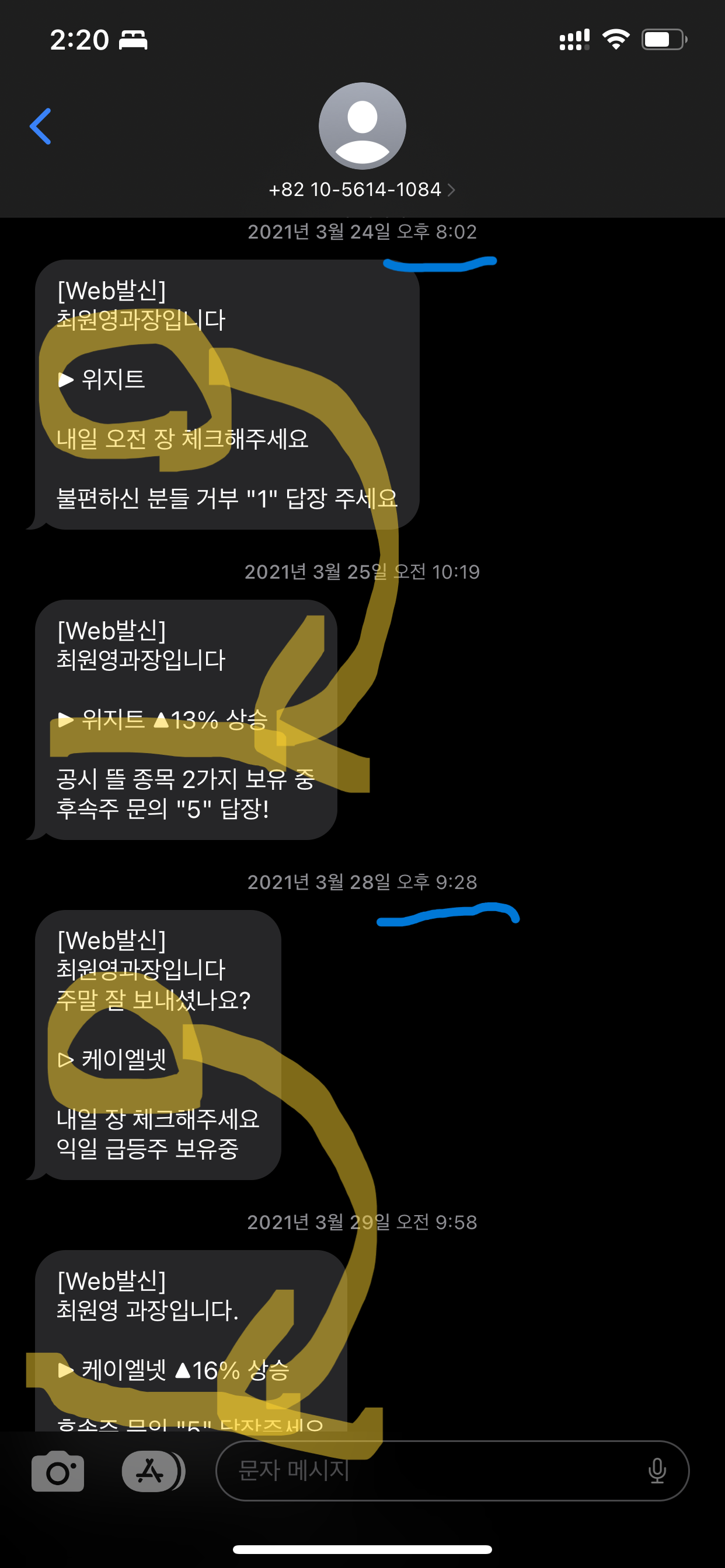 정규장 거래(오전 9시 ~ 오후 3시 30분)가 끝난 후, 차트에 바로 표시되지 않는 '시간 외 거래'의 결과를 골라서 메시지를 보내고, 마치 내일 상승할 종목을 맞추는 것처럼 메시지를 보내는 것을 보면 저에게 메시지를 보내는 최원영 과장은 사기꾼인 것 같아요.
