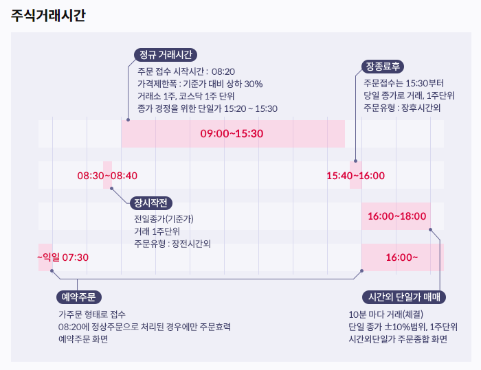 일반적으로 주식을 거래하는 시간(09:00~15:30)을 정규 거래시간이라고 합니다.