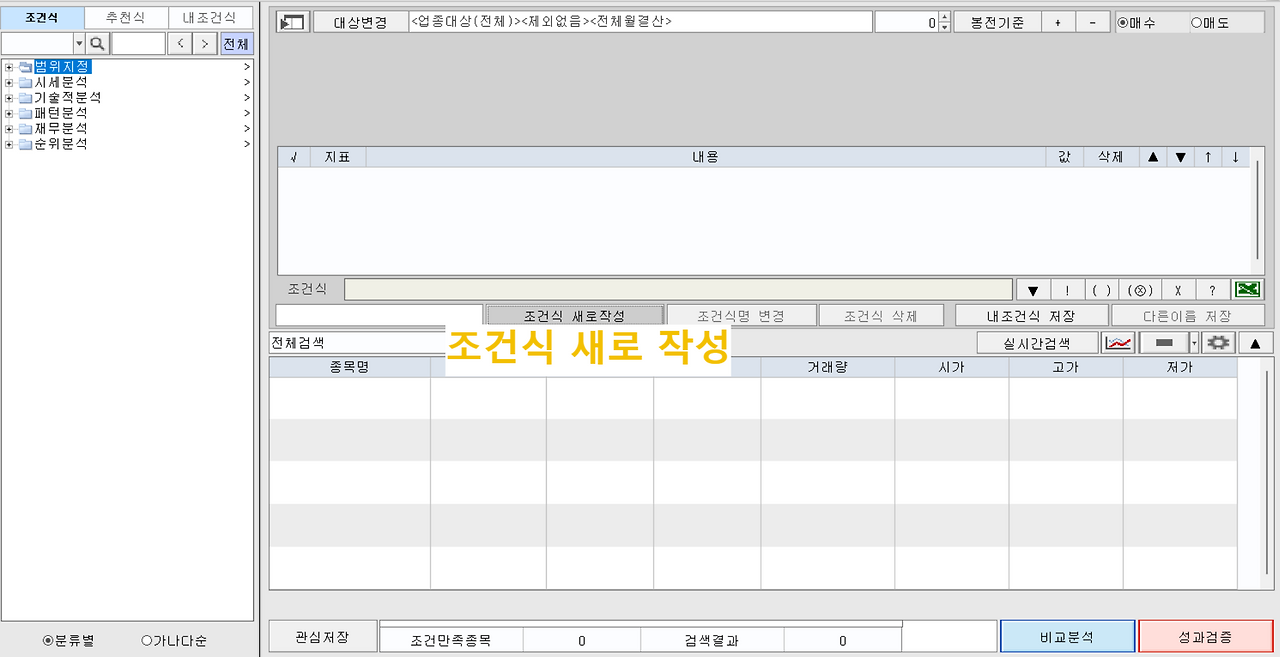 만들 수 있는 조건의 종류는 좌측 상단의 큰 구분 6가지 속에 작은 구분 100여 가지로 모든 보조지표를 표현할 수 있어요.