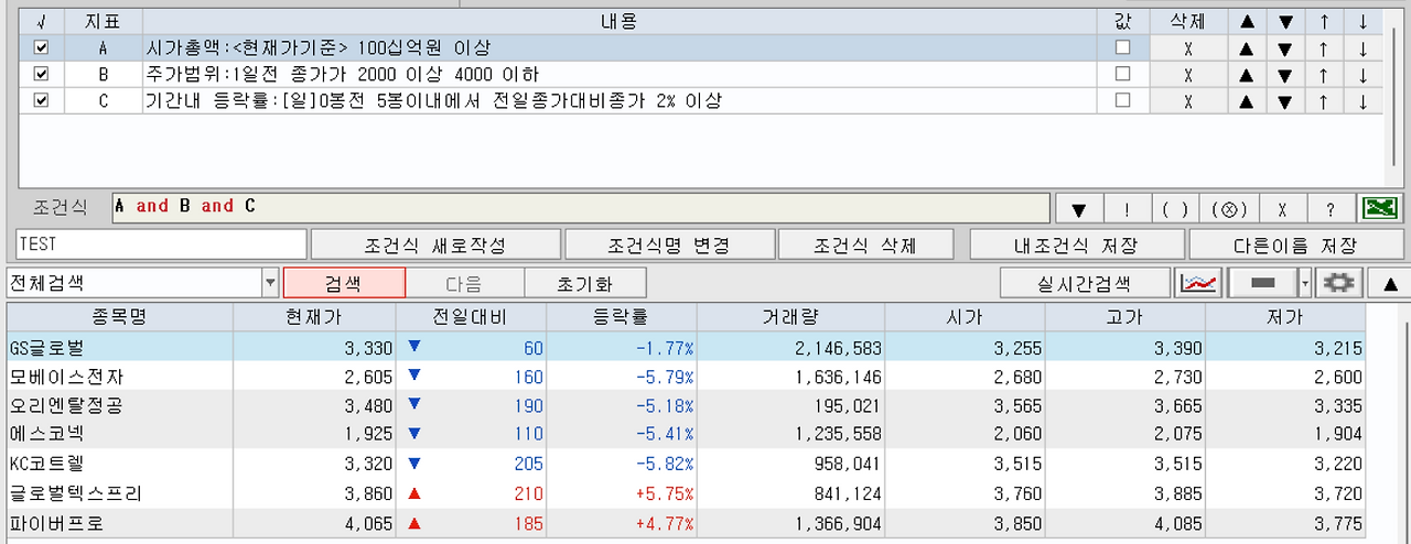 시가 총액이라는 조건 하나, 주가범이 조건 하나, 기간 내 등락률 하나씩 추가하며 조건을 만들어요. 내가 원하는 조건들을 얼마든지 추가할 수 있지만, 너무 많은 조건을 추가하면 오히려 조건에 충족하는 종목이 없을 수 있어요.