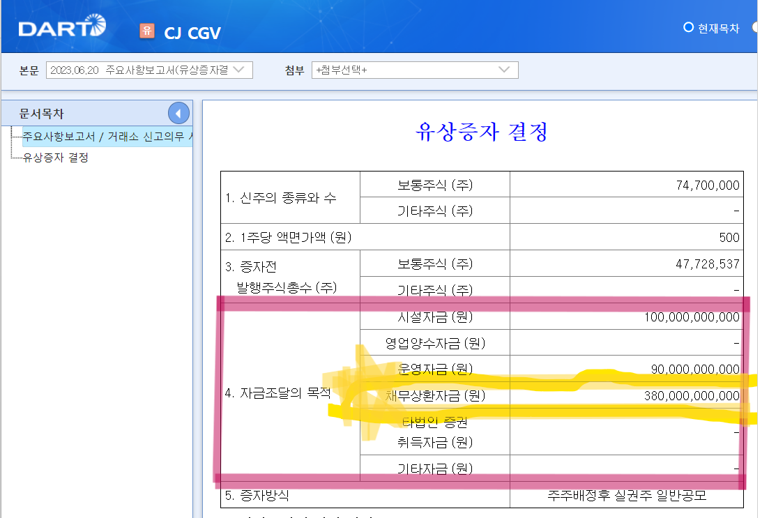 망해가는 CGV 같지만 신주가 발행되고 나면 다시 주가가 오를 수도 있으니, 유상증자가 꼭 악재라고 보는 것보다 전체적인 흐름과 목적을 이해하는 것이 필요해.