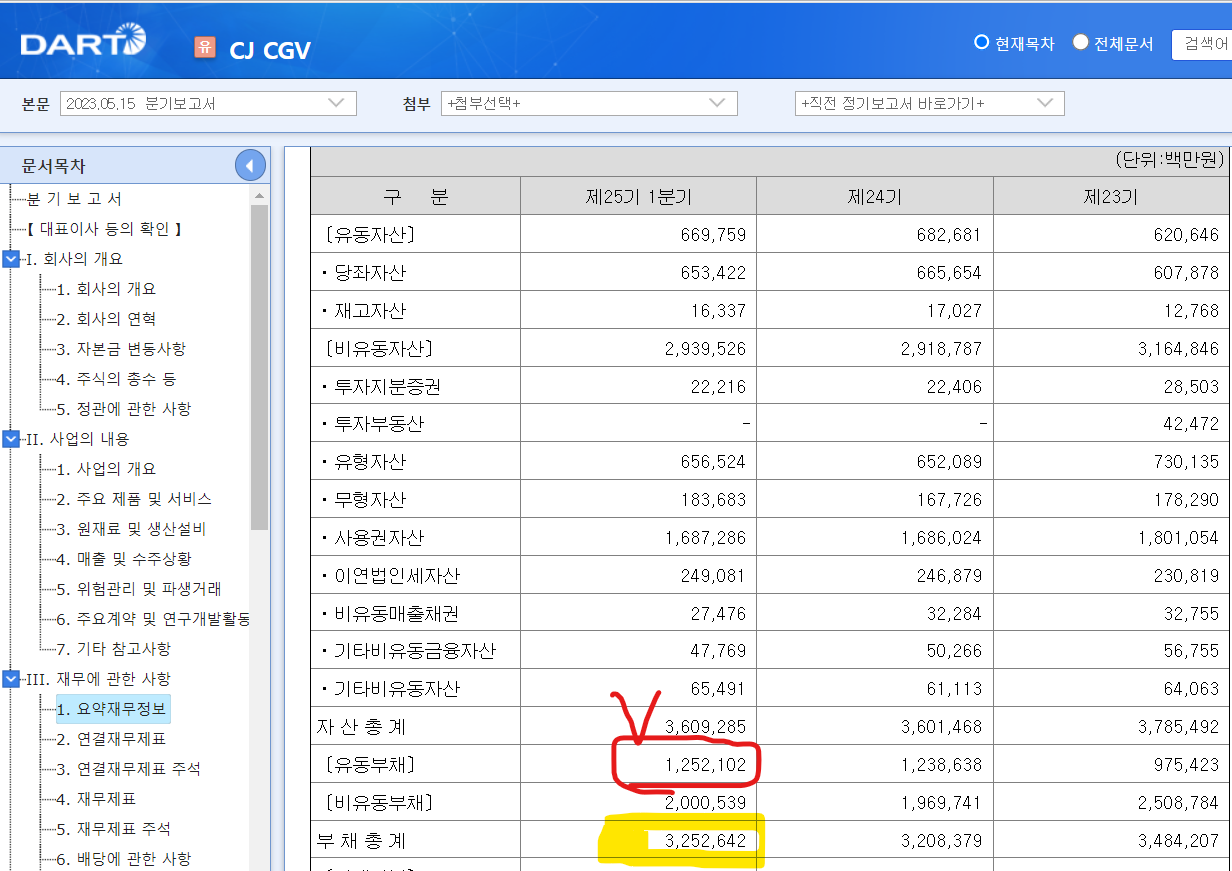 1년 안에 갚을 빚이 1조 2,521억이고, 1년 이후에 갚을 빚이 2조가 더 있더라고.