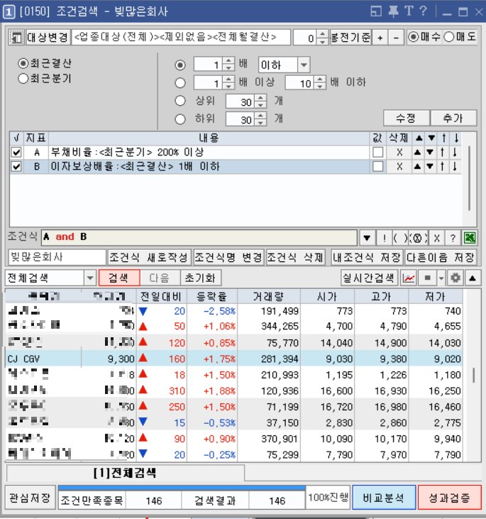 빚의 절대 금액이 많지만, 빚이 회사가 가진 돈보다 많은 경우(부채비율 200% 이상)가 CGV만 있는 것은 아니야. 여기에 번 돈으로 이자를 못 갚는 경우(이자보상배율 1 이하)도 146개나 있어.