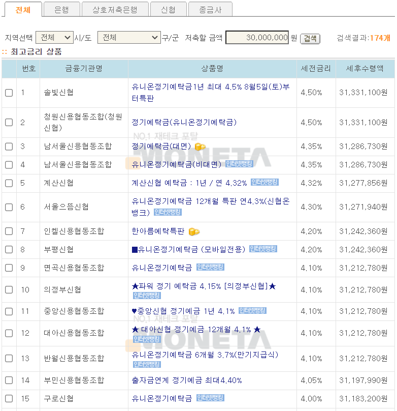 4.5%의 정기예금에서 이자가 133만 원인 곳도 있고, 4%의 금리인데도 이자가 세후 118만 원이 넘는 곳도 있지.