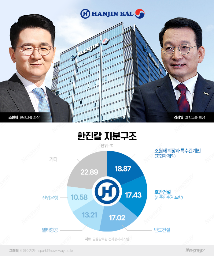 하지만 여전히 호반건설이 가진 약18%의 지분이 다른 세력들과 손을 잡고 경영권을 위협할 수 있기 때문에, 산업은행의 지원으로 아시아나를 인수하여 아시아나의 지분이 대한항공으로 바뀌면서 조원태의 지분을 높이는 합병에 사활을 걸 수 밖에 없어요.