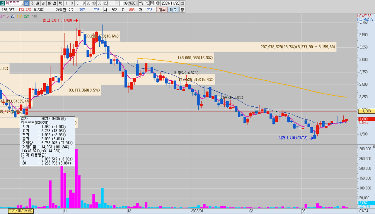 23년 11월 위즈코프는 800원입니다.