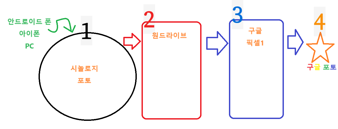 하지만, 간혹 여러 디바이스가 원드라이브에 접속을 하면, 3구글픽셀에서 2원드라이브의 로그인이 풀리는 경우가 있어서 연결의 안정성을 위해 다양한 기기의 업로드를 받는 1시놀로지(NAS) 를 추가하였습니다.