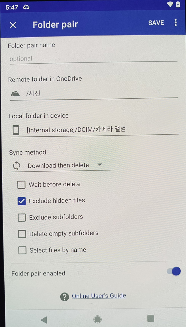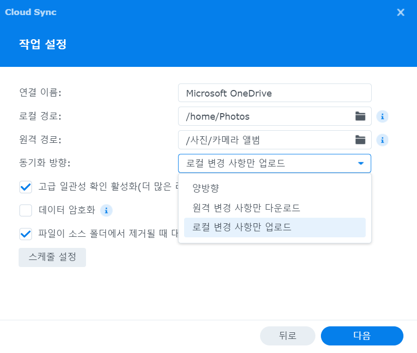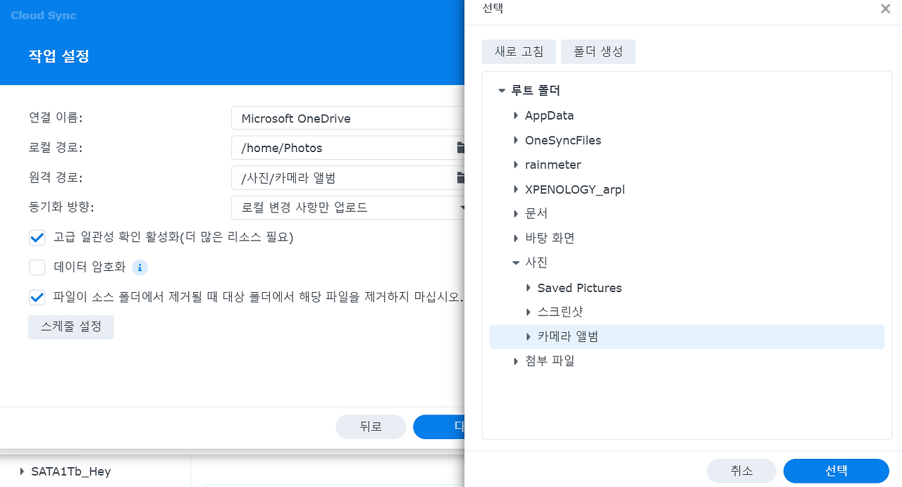 마. 원드라이브의 사진은 픽셀 1에서 다운로드 후에 삭제할 것이므로 로컬(시놀로지)에서는 업로드만 하는 것으로 설정