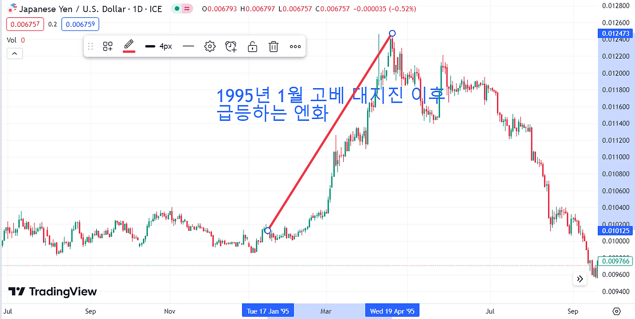95년 1월 17일 부근에서 100엔을 사려면 1.01달러 정도였으나