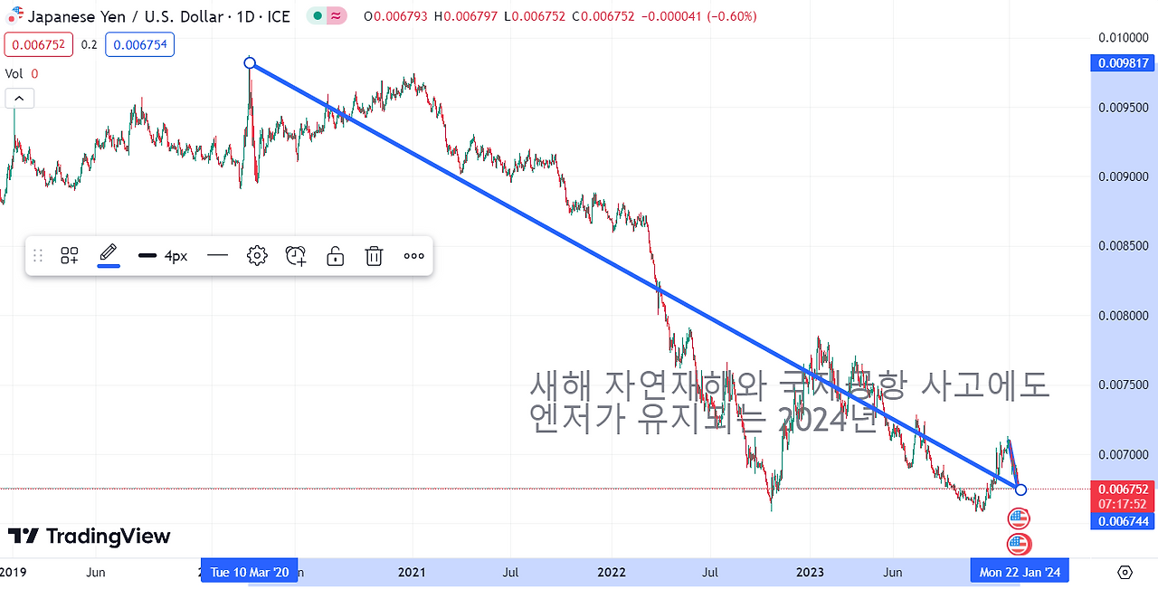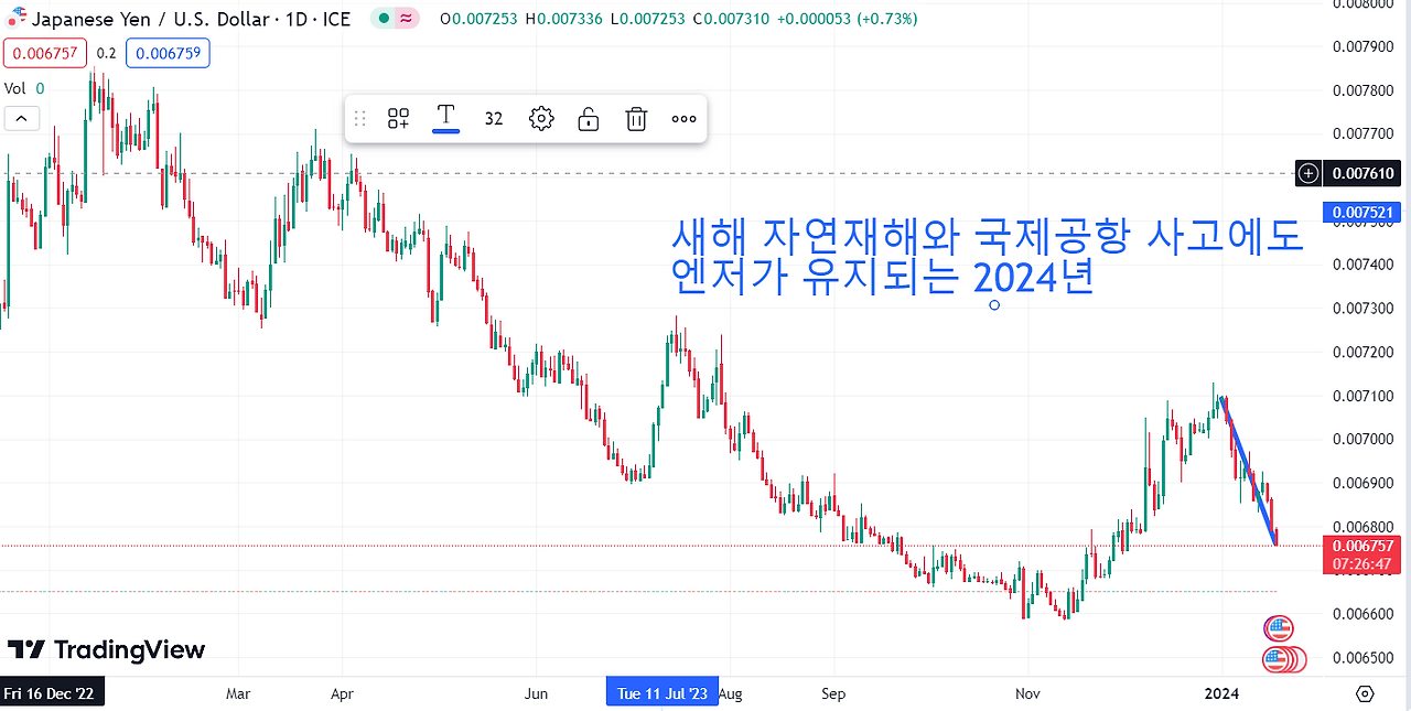 미국은 2년동안 강하게 높은 금리를 유지하면서 미국의 물가를 잡겠다는 명목으로 달러의 강세를 추구했습니다. 이번의 자연재해로 인한 엔화의 수요도 미국의 고금리로 발생한 엔저 현상을 바꾸지 못한 것으로 보입니다.