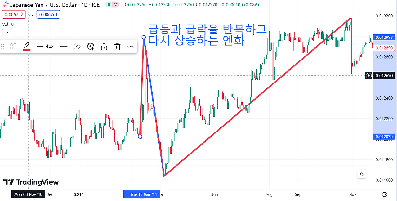그리고 비슷한 기간에 걸쳐서 다시 엔화는 상승분을 반납하고 하락했습니다.