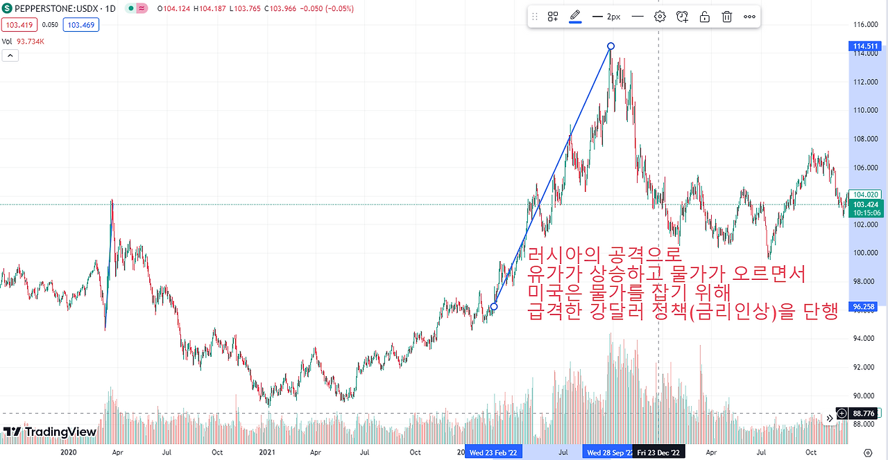 22년 2월 러시아가 우크라이나를 공격하면서, 미국은 다시 급격한 강(비싼)달러 정책을 단행했습니다.