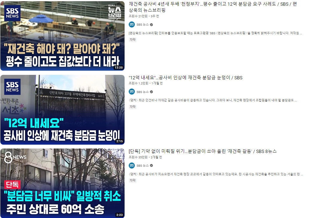 새로 지은 집들의 가격은 일반적인 가계에서 대출을 받을 수 없을 만큼 비싸고, 재건축으로 수익을 기대하던 사람들도 상승한 추가분담금을 위한 대출을 받을 수가 없는 지경입니다.