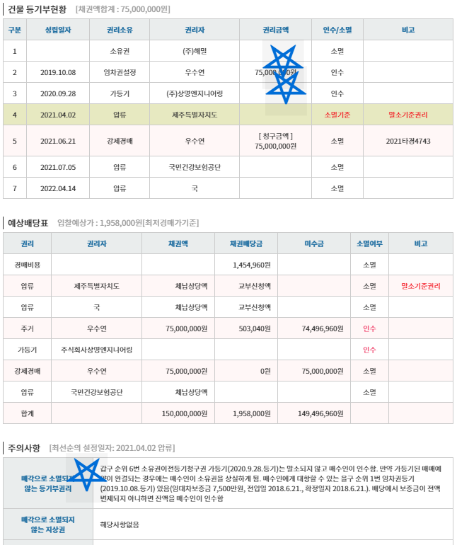 주의1) 소멸기준 위에 있는 인수권리금액은 낙찰자가 권리소유자에게 줘야 하는 돈입니다.