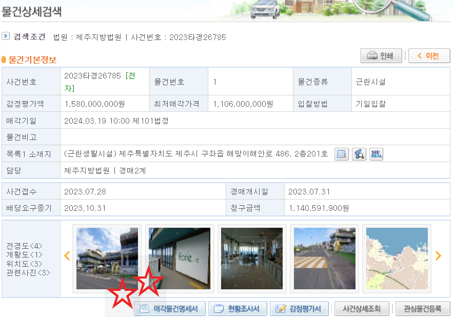 ☆☆매각물건명세서 버튼은 경매개시 일주일 전에 생깁니다.
