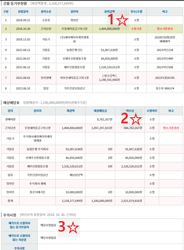 1☆ 과 2☆처럼 말소기준권리 위로 다른 권리가 없는 것과 3☆처럼 해당사항이 없는 것.