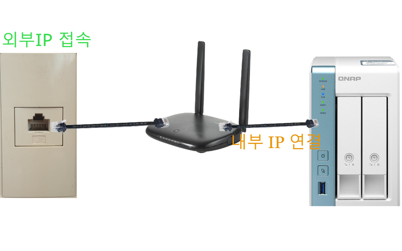 1. 벽에 꽂은 랜선이 KT공유기에 우선 연결되고 NAS는 KT공유기와 랜선으로 연결되어 있어야 외부 주소를 통해서 연결이 가능하다. (벽Lan - kt 공유기 - nas)