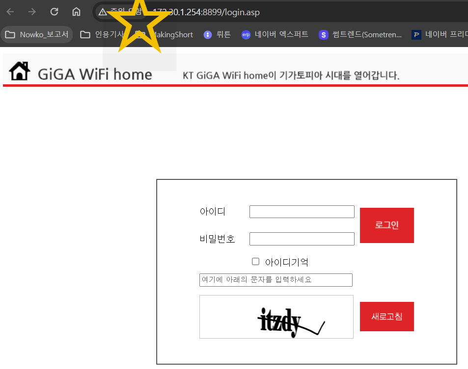 주소창에 확인된 IP주소를 입력하면 KT공유기에 기본으로 설정된 포트로 접속하도록 되어 있어요.