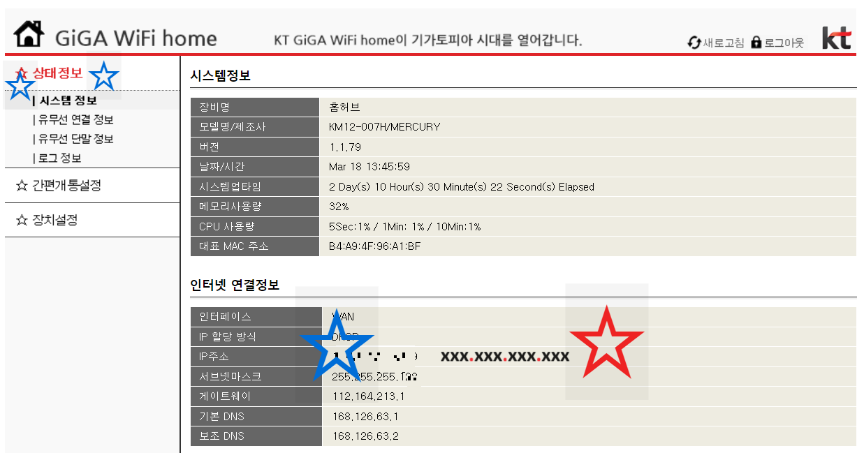 KT 공유기 설정의 ☆상태정보 - 시스템 정보에서 확인할 수 있습니다.