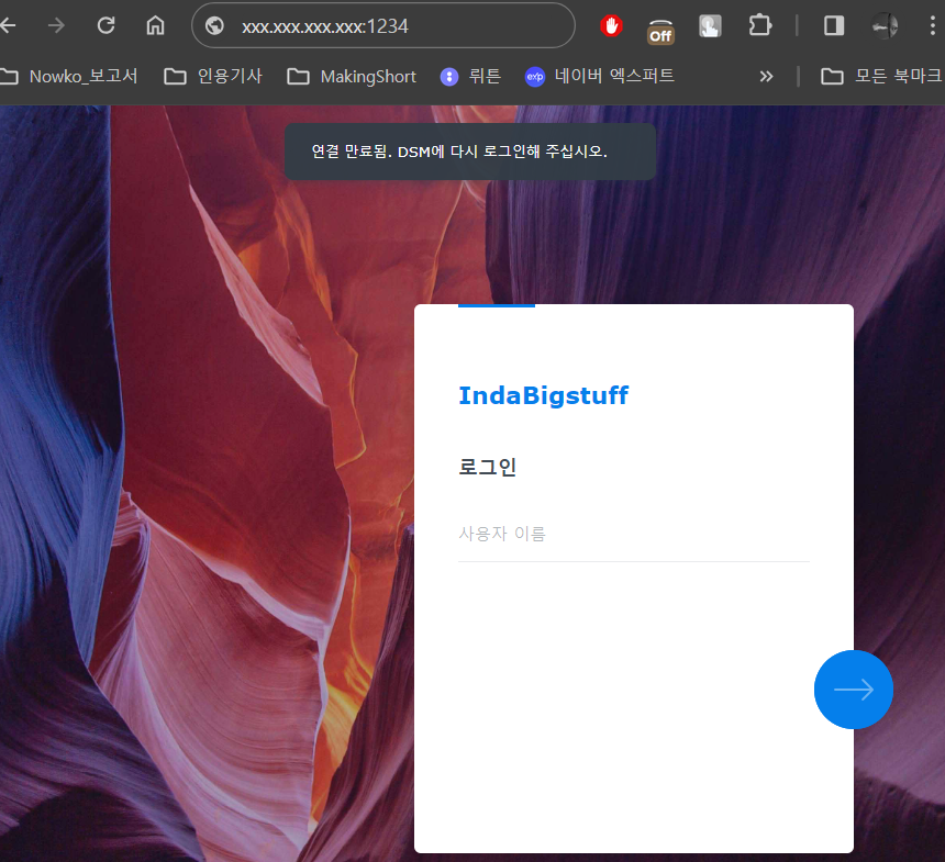 외부에서 저의 나스에 접속할 주소는 xxx.xxx.xxx.xxx:1234 (일반적으로 5000을 사용합니다만, 다른 사람들의 예측 접속을 방지하기 위해서 일반적이지 않은 1234로 했습니다.)입니다.