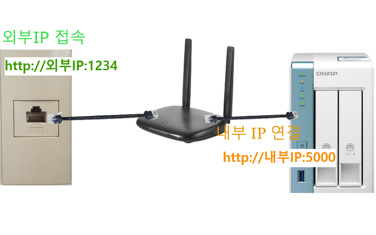외부의 컴퓨터로 인터넷 주소창에 나의IP:1234 (1234는 임의의 숫자입니다. 나스에 정확하게 연결을 하려는 번지수 지정해 주는 것과 비슷합니다.)를 입력하면