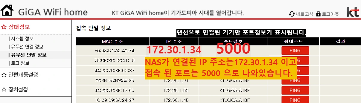 그러면 KT 공유기가 172.30.1.34:5000 (KT공유기에서 나스의 일반적인 포트인 5000번으로 설정했습니다만, 나중에 NAS에서 포트를 변경할 수도 있습니다.)에 연결된 NAS로 연결해 줍니다.