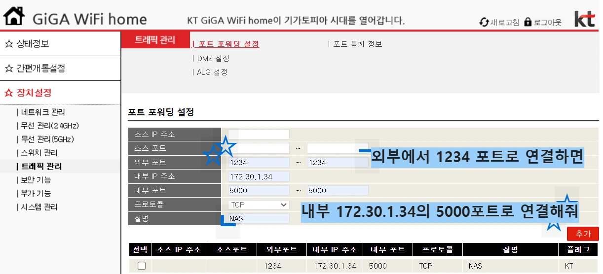 KT공유기에 연결된 NAS에 접속할 포트를 설정할 것입니다.