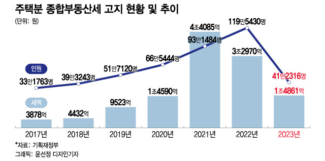 119만 5430명이 내던 종합부동산세를 41만 2316명으로 줄이고 세금은 2조 원이 줄었습니다.