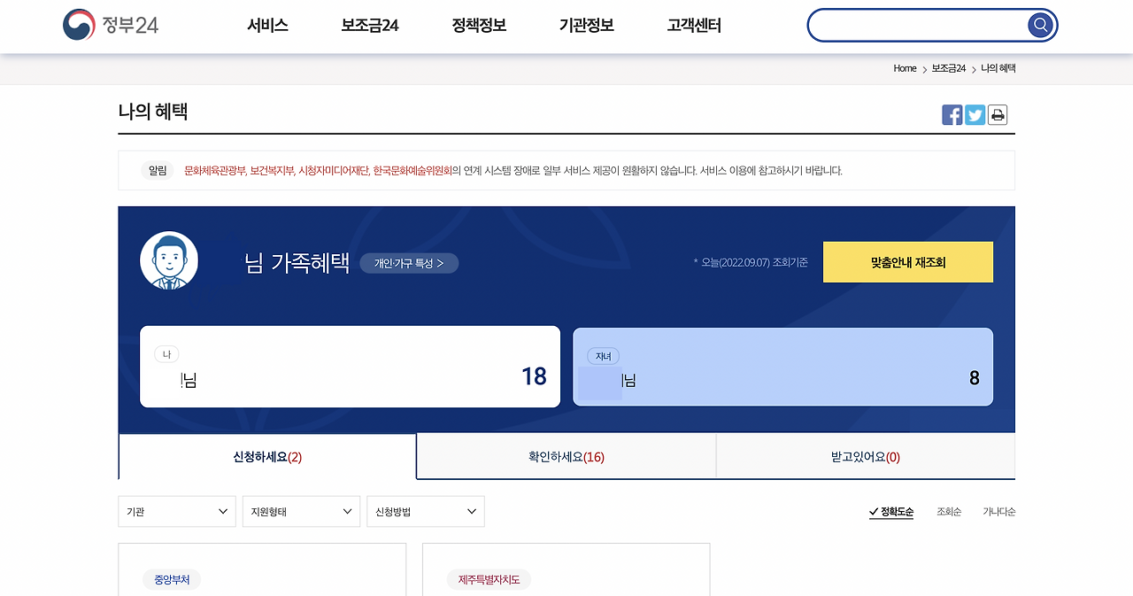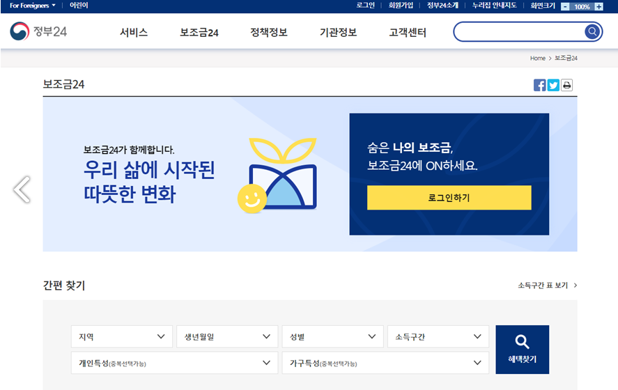 정부 보조금 중 나의 대상여부를 직접 확인하고 신청까지 할 수 있는 서비스입니다.