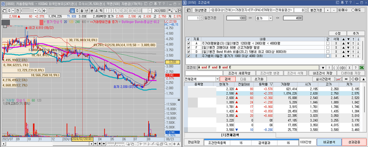 4. 그리고 가격이 오를 때 개미들이 너무 싼 것은 또 외면하기 때문에, 개미들이 선호하는 가격대인 1,000원~ 4,000원 선의 종목으로 추린다.
