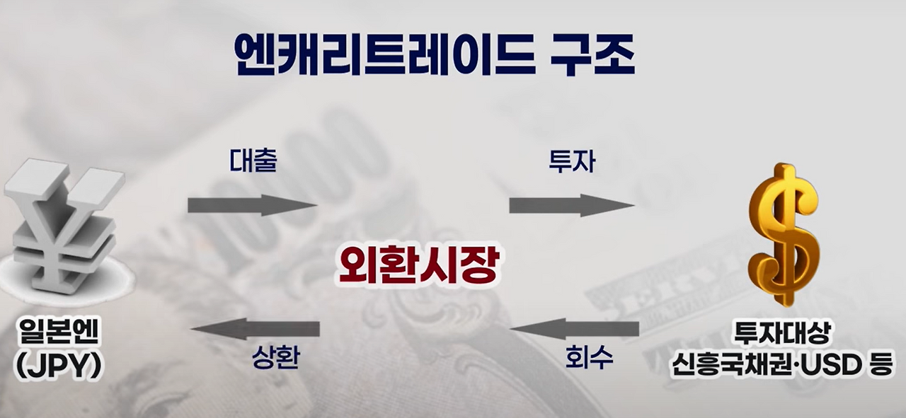 이자가 낮은 일본에게 돈을 빌려서 다른 나라에게 투자를 하던 '엔케리트레이드' 자금들에게는 엔화의 이자가 오르고, 달러의 이자가 낮아지면 수익이 줄어들거나 혹은 거의 없어질 수 있는 상황으로 만들어졌어요.
