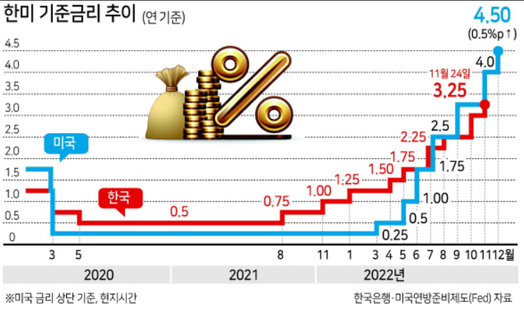 그런데 미국이 금리를 올린 이후 한국의 금리는 3.5%로 오히려 5.5% 수준의 미국보다 절반 수준으로 낮아졌습니다.